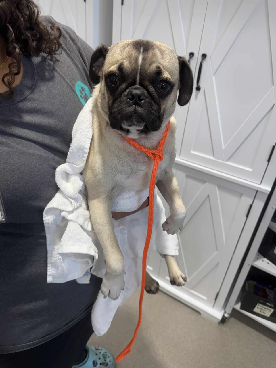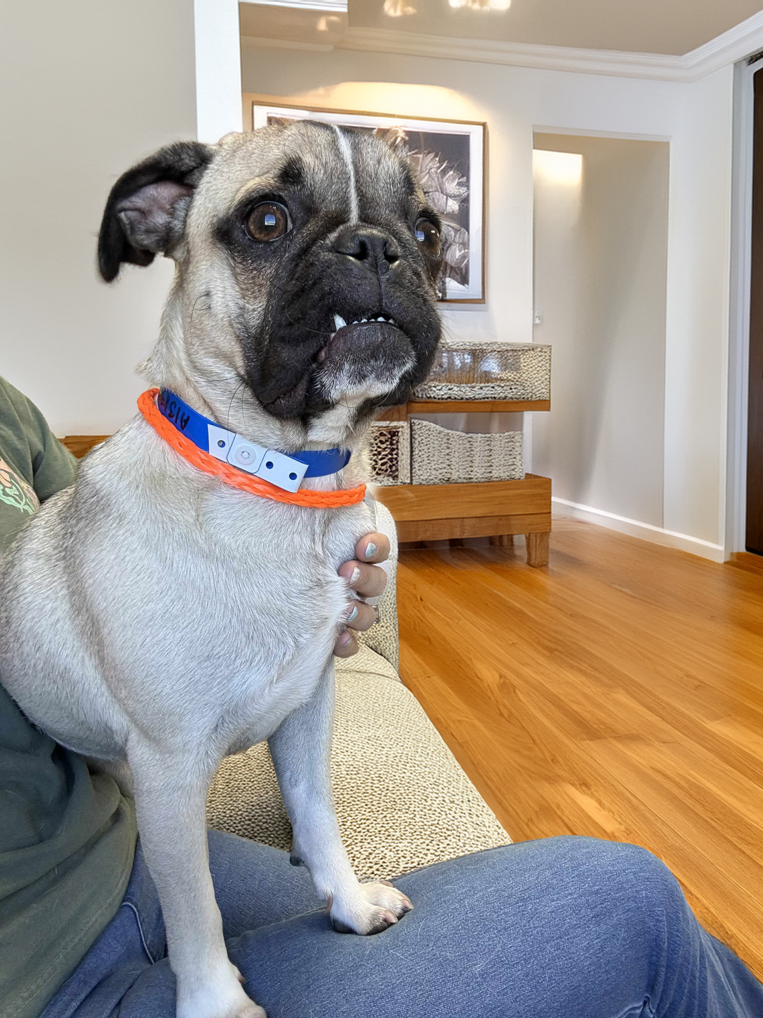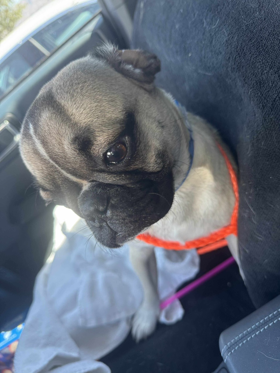Meet Carlitos! A little ~1 year old boy with the most adorable teefers and markings. Originally from Las Vegas, NV, Carlitos came to Evergreen Pug Rescue after being found as a stray and completing the necessary holds.