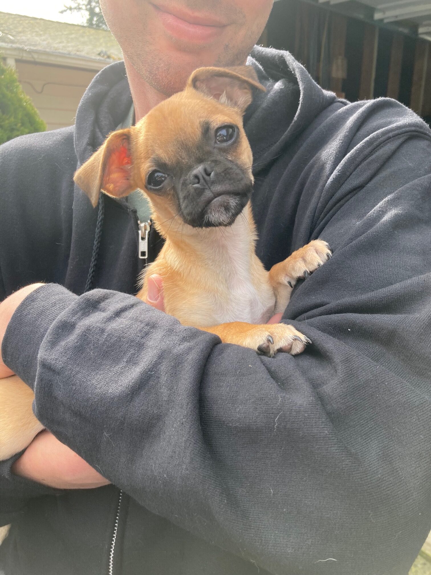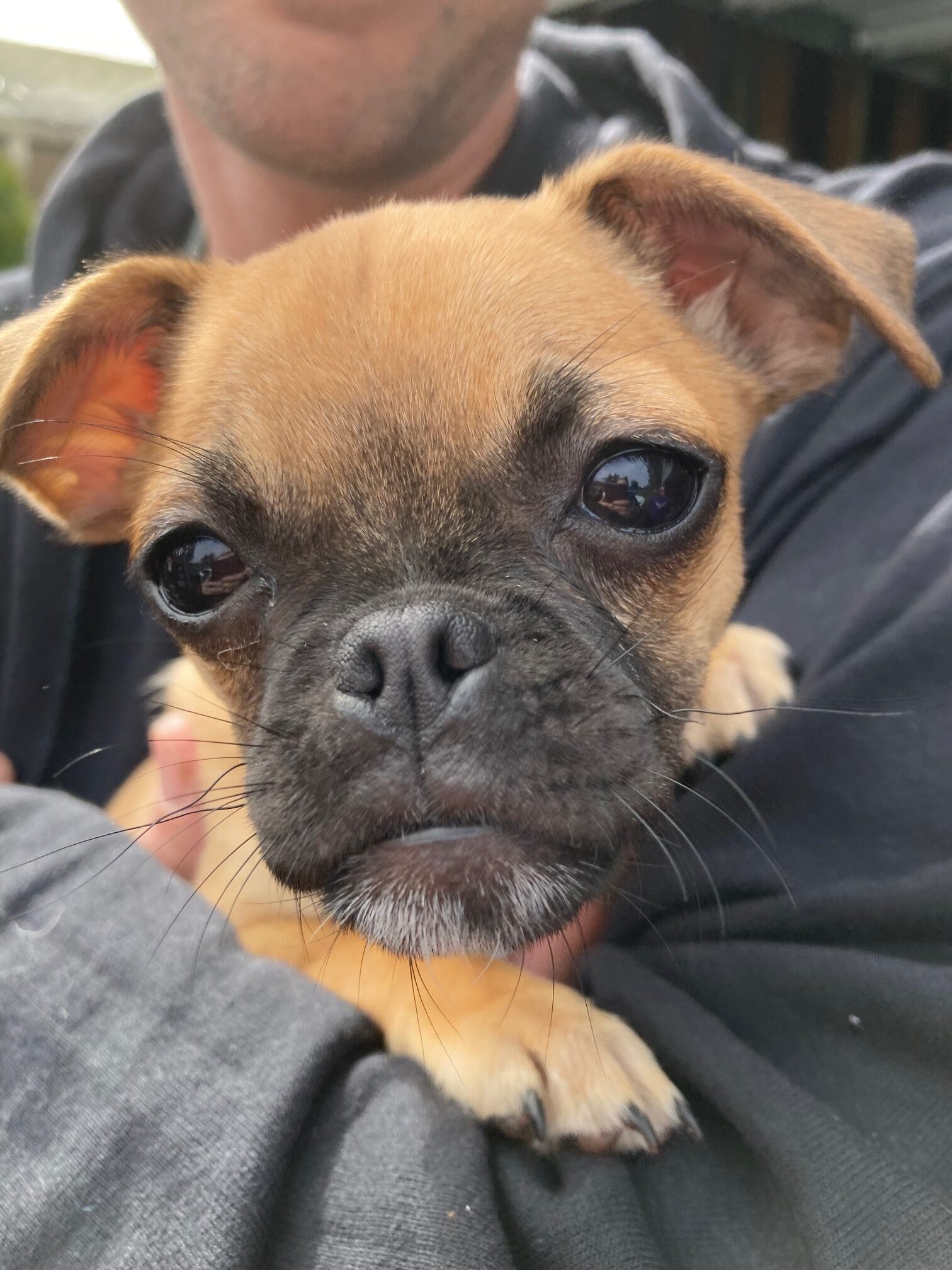 Meet Daisy! When the shelter reached out to us about 2 tiny chugs, we said yes without hesitation. Daisy is about 4 months and 4 pounds and she couldn't get any cuter! Her longer snoot means she can breathe a bit easier, but still has the adorable curly tail we know and love.