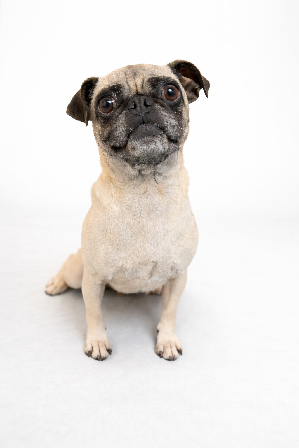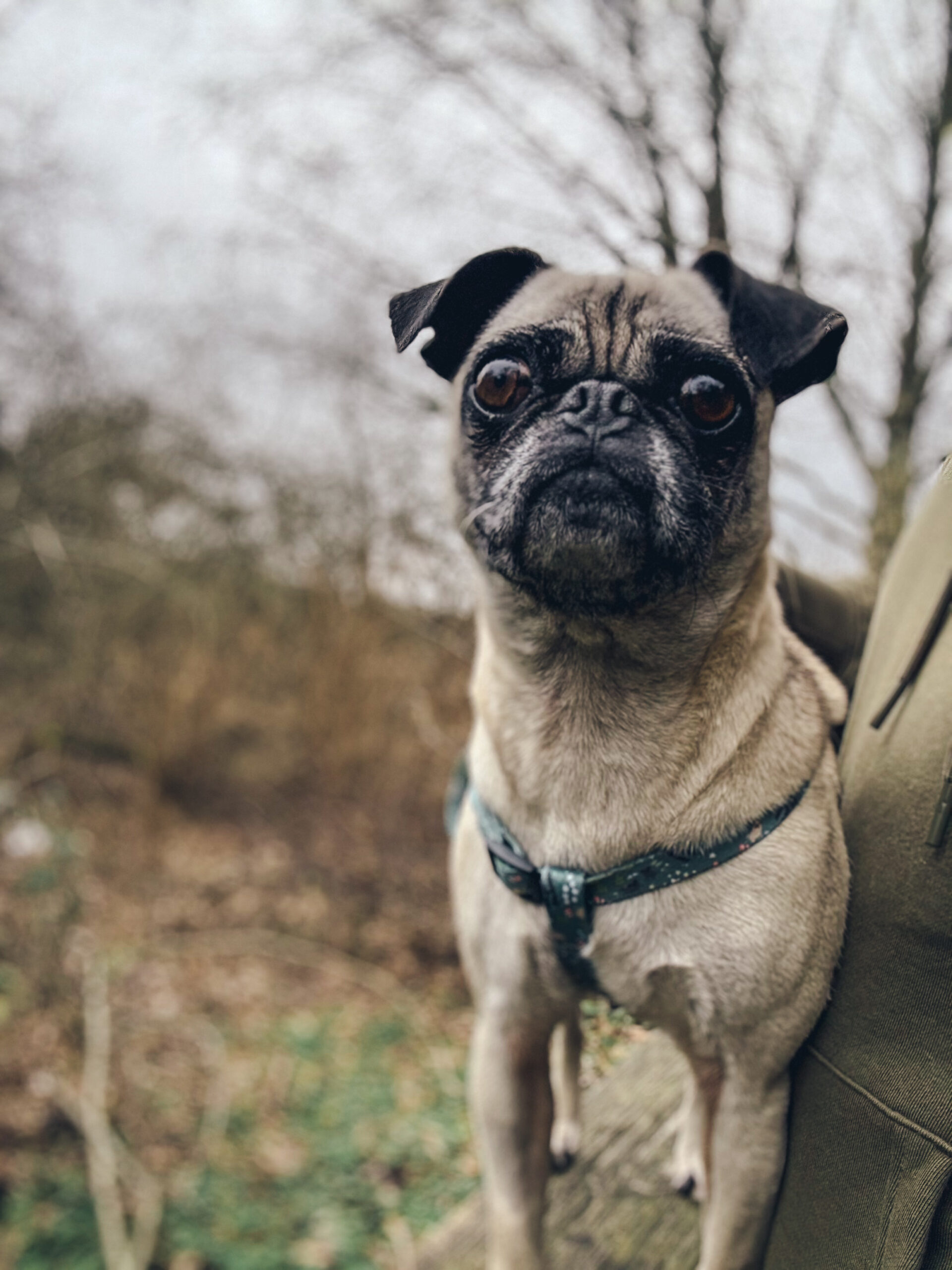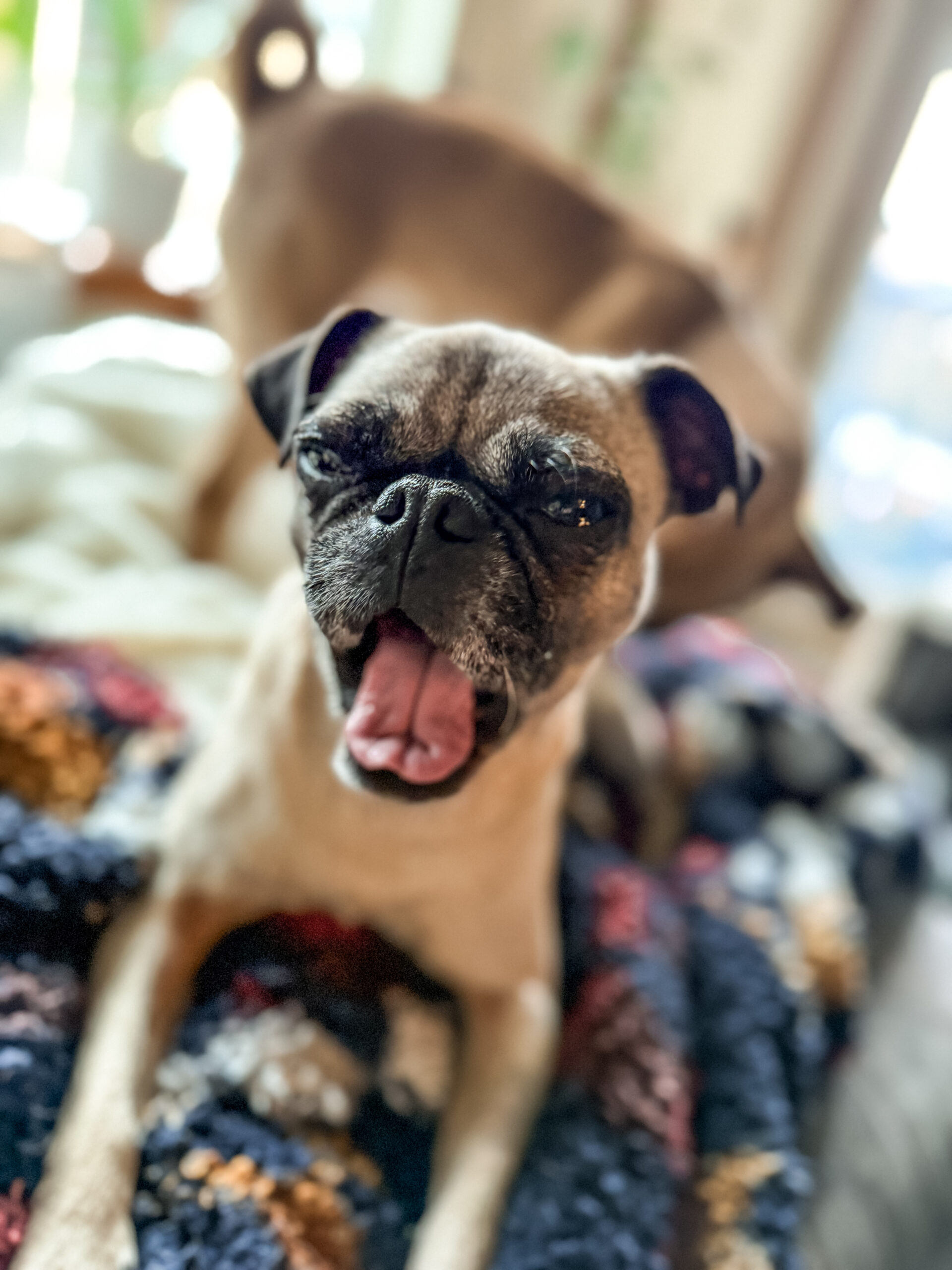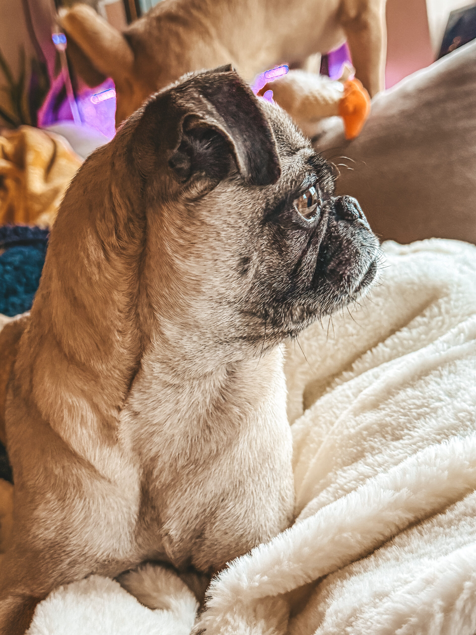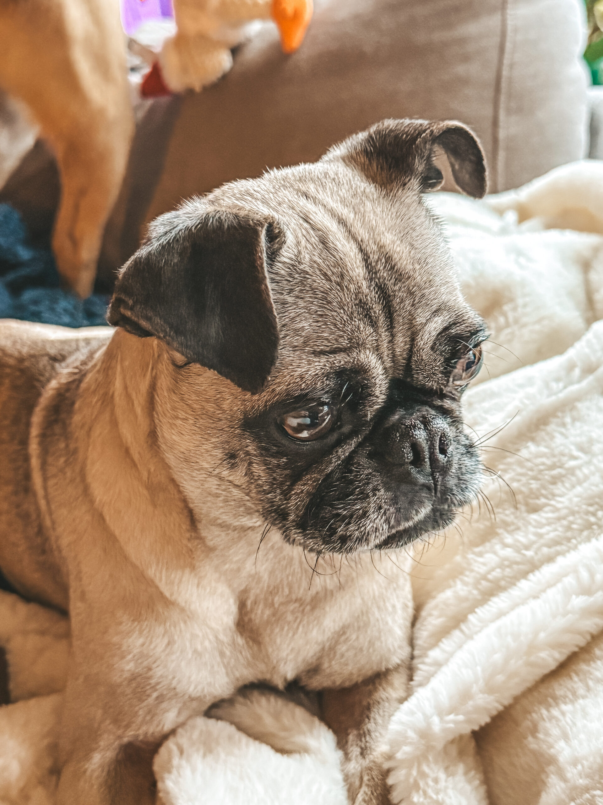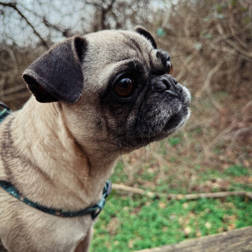 At just 13 pounds, Dolly is the perfect pint-sized companion — easy to scoop up, easy to travel with, and always ready to curl into your side. She has that soft, soulful pug gaze that makes you want to lean in… and once you do, she’s all yours.