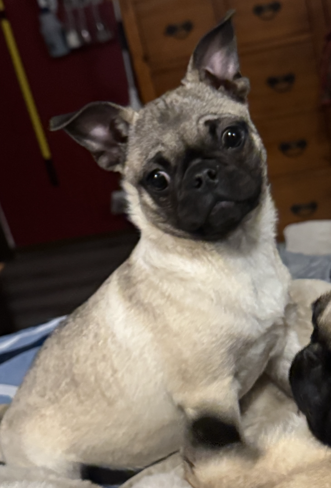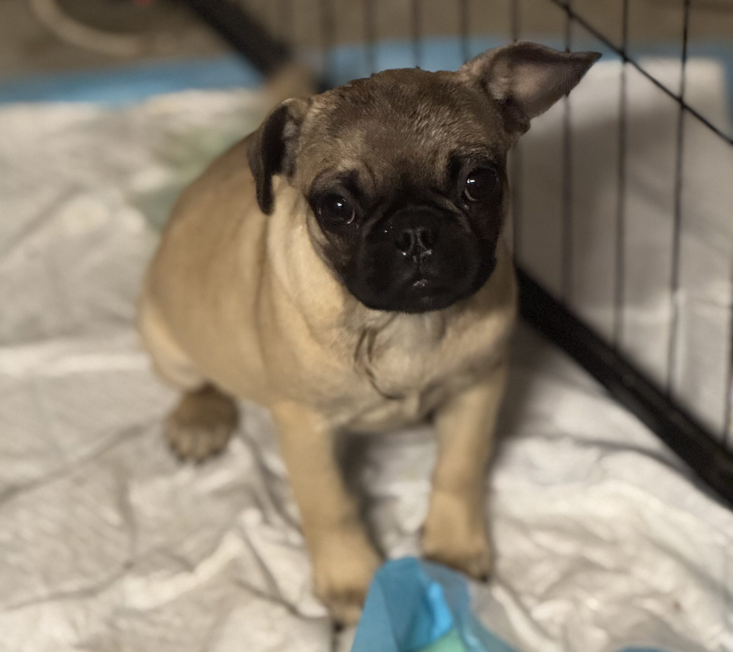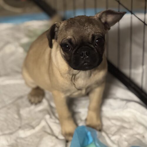 Meet Elise, a 3.5-month-old Frenchie–Pug mix puppy with a sweet, gentle spirit and a heart ready for her forever home.