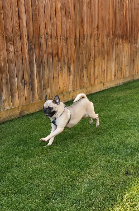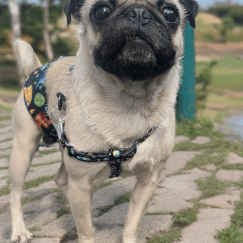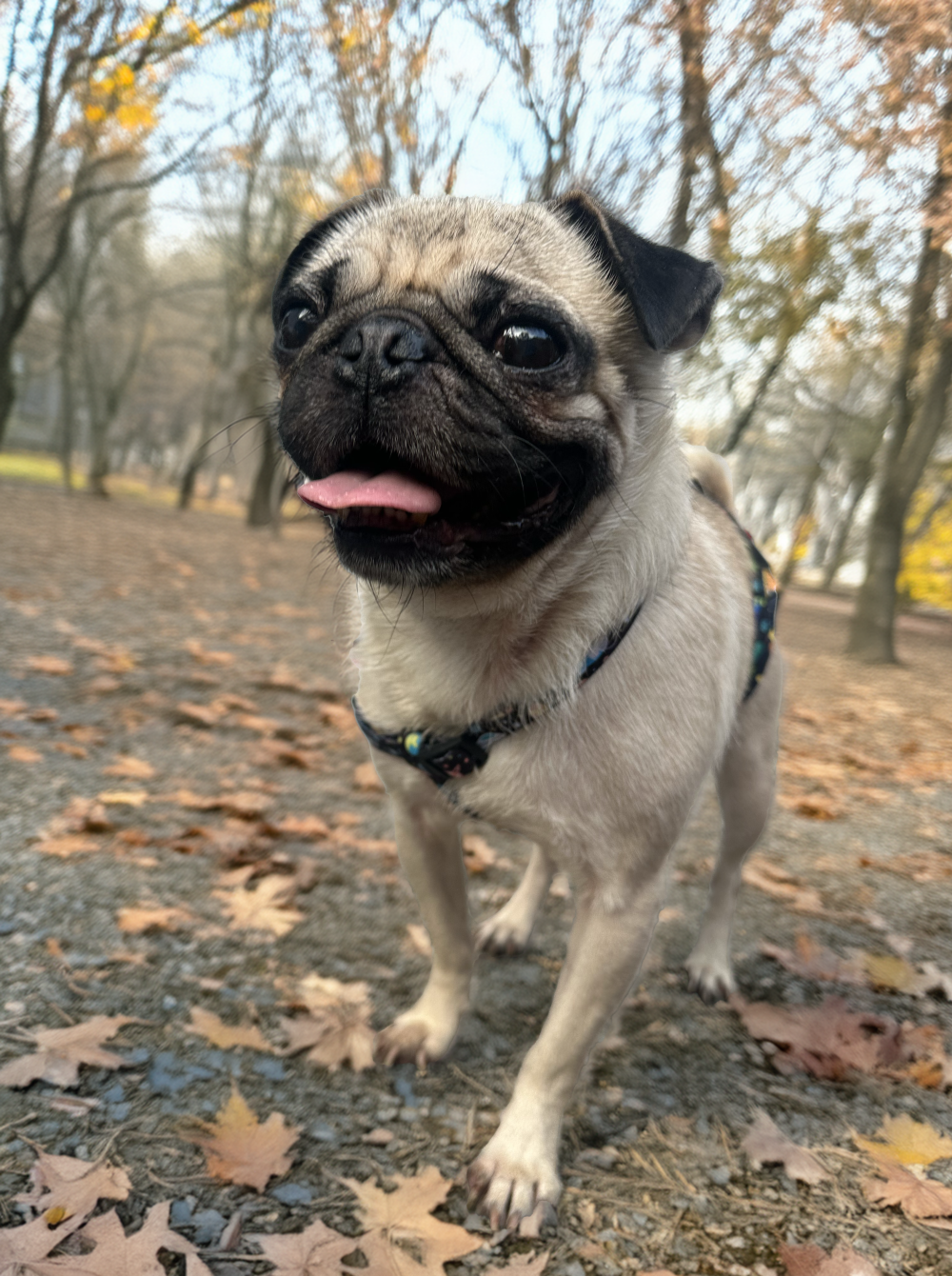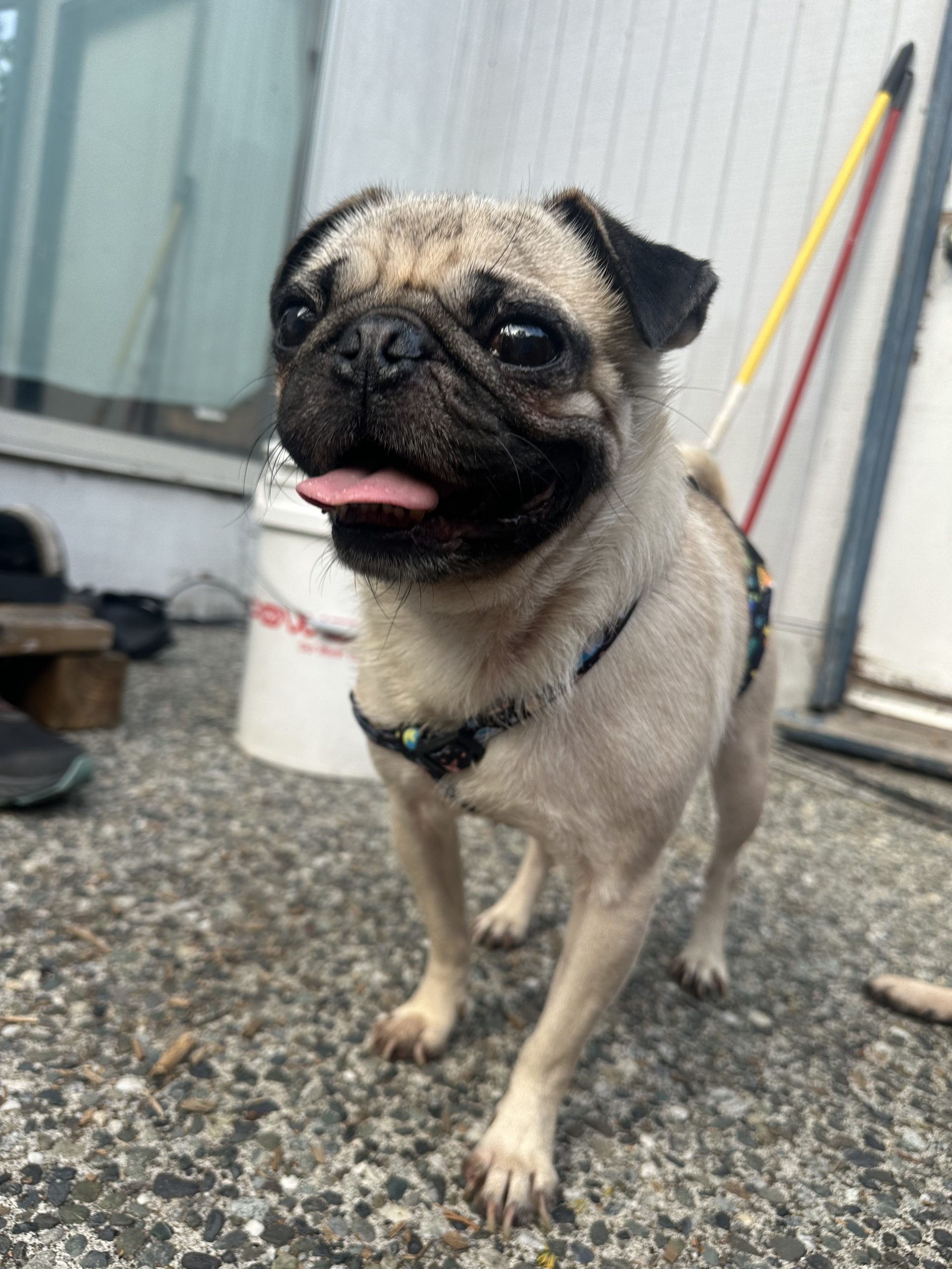 Eugene is a 5-year-old tiny pug with a soft cream coat and an even softer heart. He’s friendly, social, and absolutely full of personality!