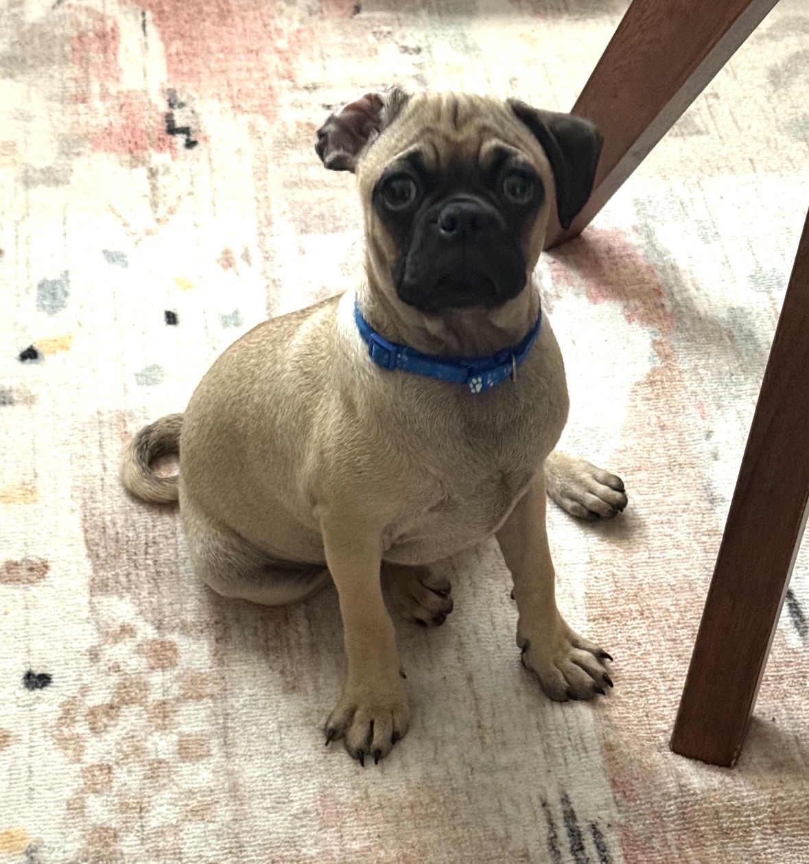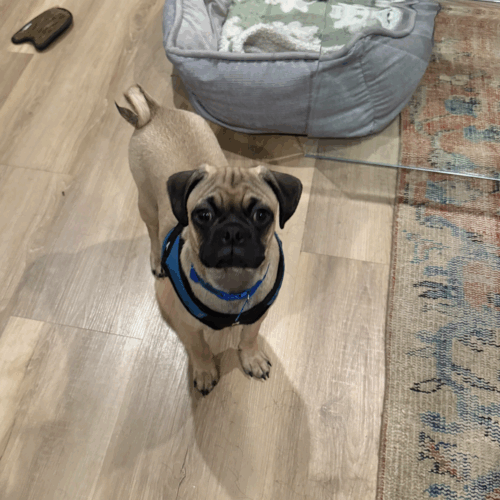 Griffin is a 4-month-old puppy recently welcomed into Evergreen Pug Rescue from The Pug Queen. His story began in rescue—his mom came in pregnant, and Griffin and his siblings were born safely in care.