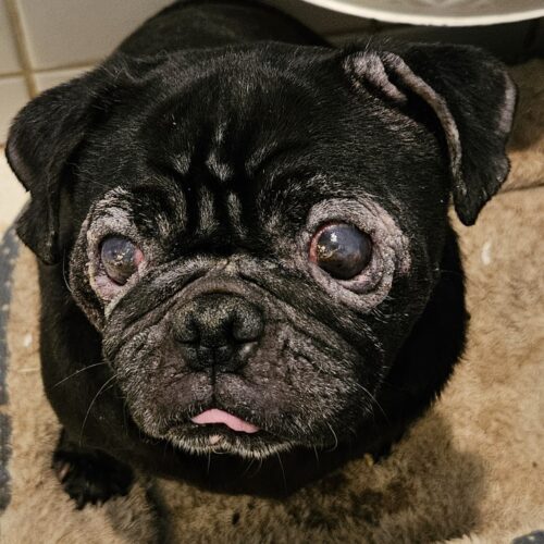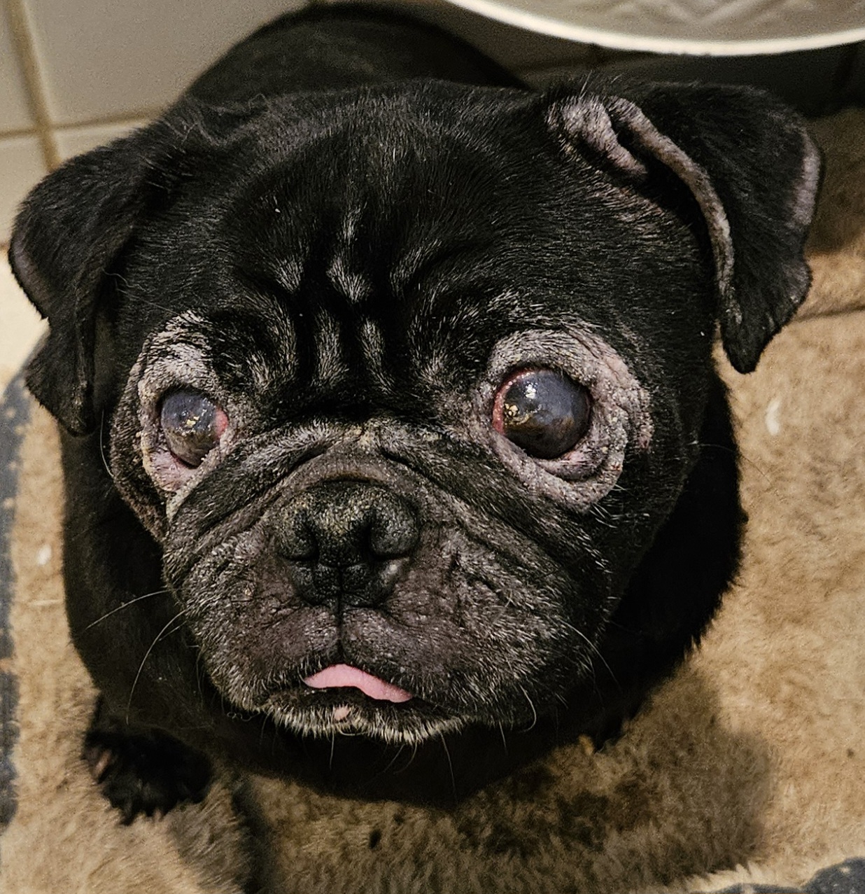 Katie is a twelve-year-old pug whose story captures both heartbreak and resilience. Blind, deaf, and unsteady on her feet, she came into rescue in fragile condition, her skin thickened and hardened after years without consistent care. One look at her says more than words ever could.