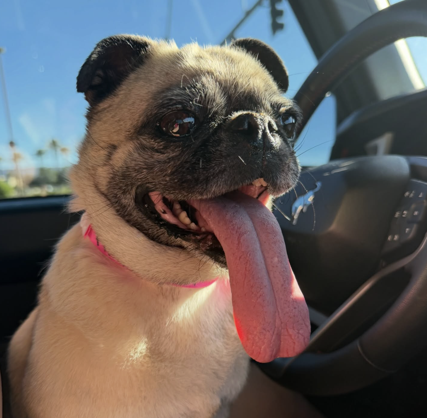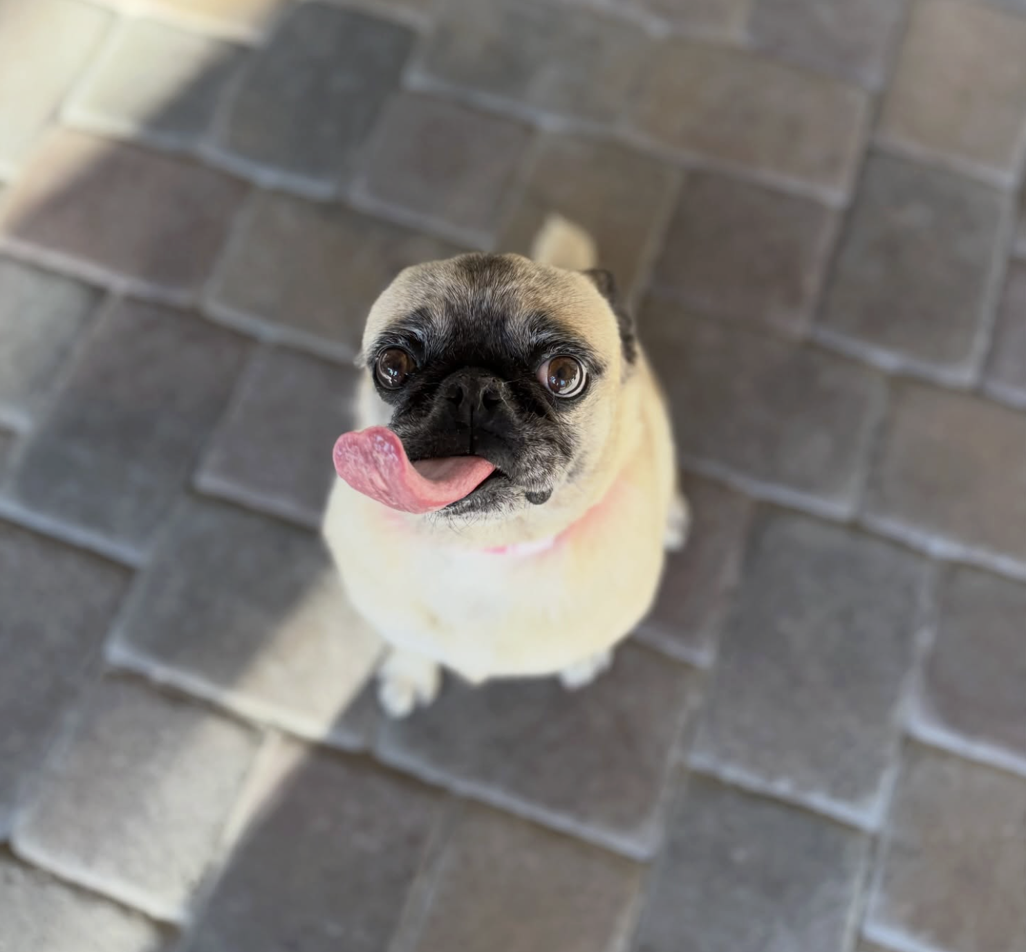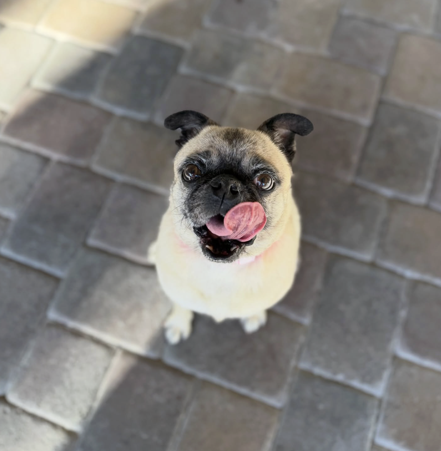 At 6 years old and 14 lbs, she is everything people love about pugs. She’s velcro, deeply affectionate, and always ready to give kisses. She wants to be with her person—on your lap, by your side, part of every moment.