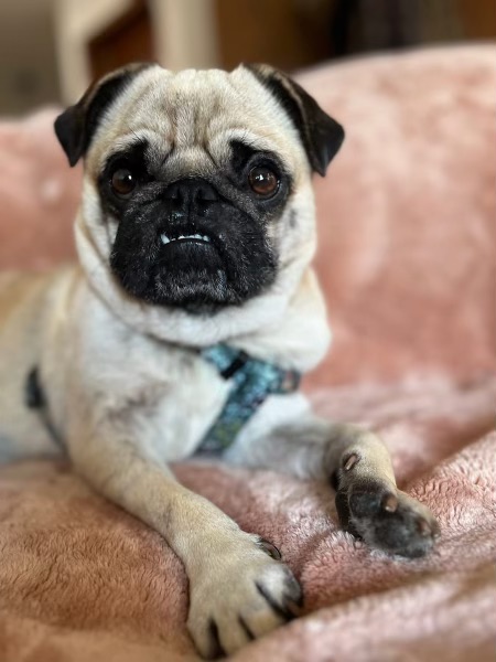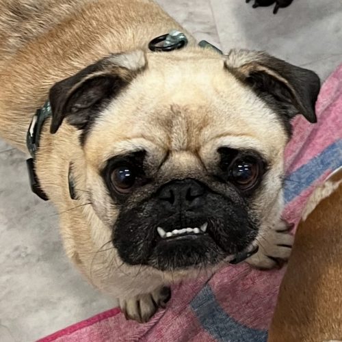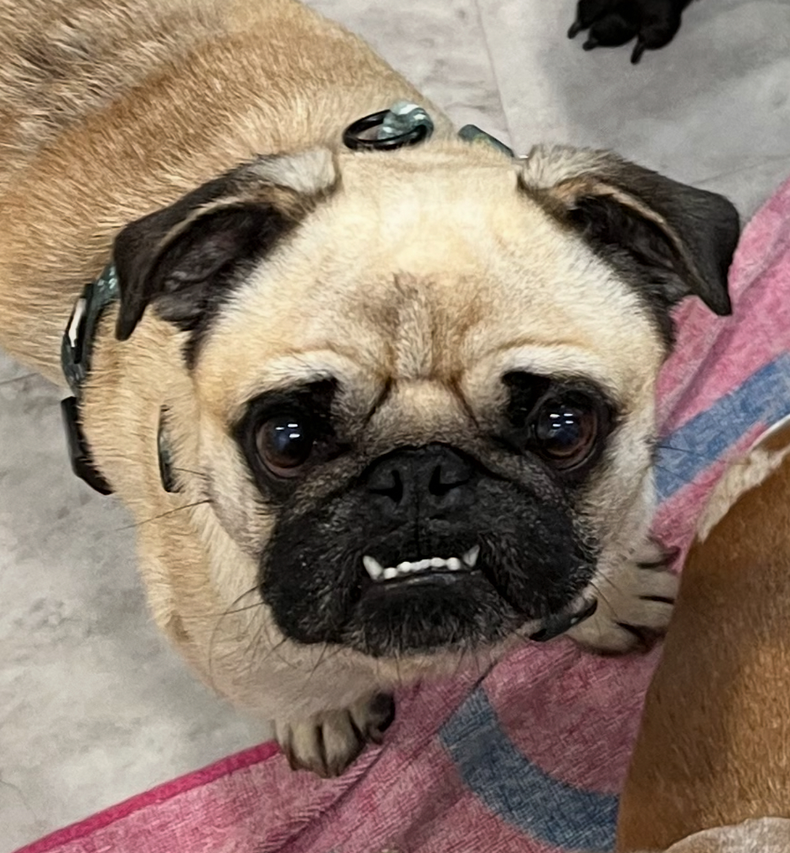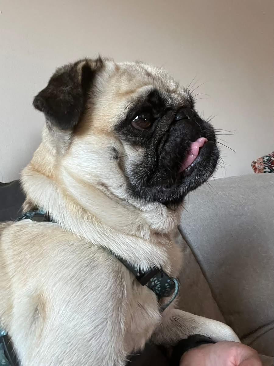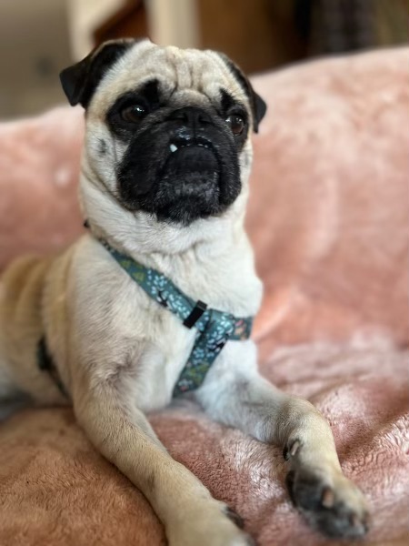 Matty is a four-year-old pug who steals hearts with his unforgettable grumpy-cat expression and irresistible charm. Behind the silly looks is the sweetest soul you could ever meet—gentle, affectionate, and full of love. Whether he’s making you laugh with his cartoon-worthy face or snuggling close, Matty reminds us daily that pugs are pure joy wrapped in wrinkles.